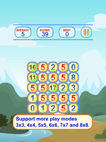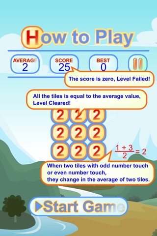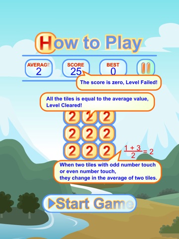 The average of two tiles. Tap on a tile in the grid, then move to the tiles. When two tiles with even number touch or odd number touch, they change in the average of two tiles and the score will be reduced. All the tiles is equal to the average value, Level Cleared! The score is zero, Level Failed!