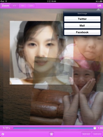 각각 사진이 같은 비율로 합성하기 위하여 새로 붙이는 사진은 점점 옅어집니다.