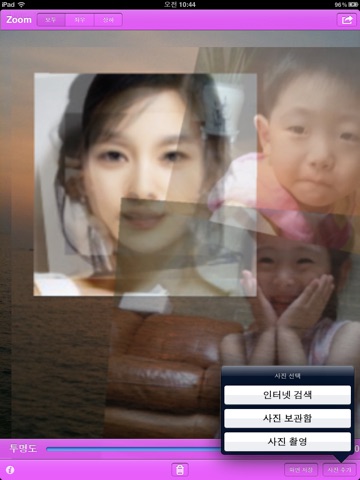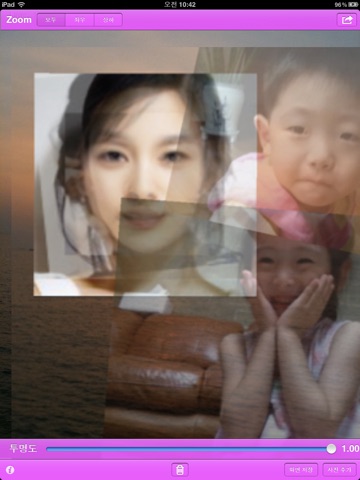 3. 화면에 사진이 나타나면 한손가락으로 이동, 두손가락으로 확대, 축소, 회전, 이동을 통해 한장씩 앞의 사진에 맞춥니다. 이렇게 한장씩 추가합니다.