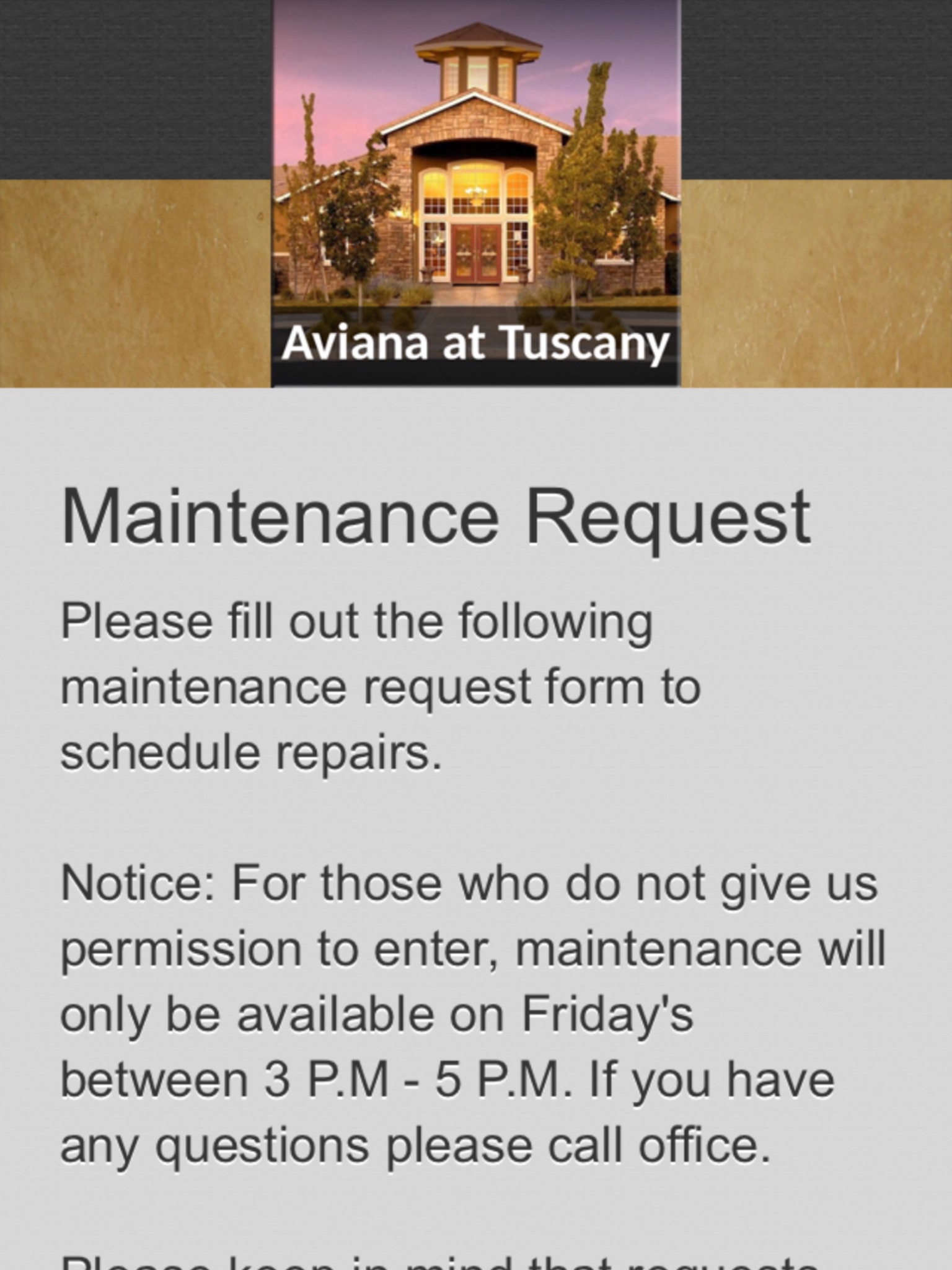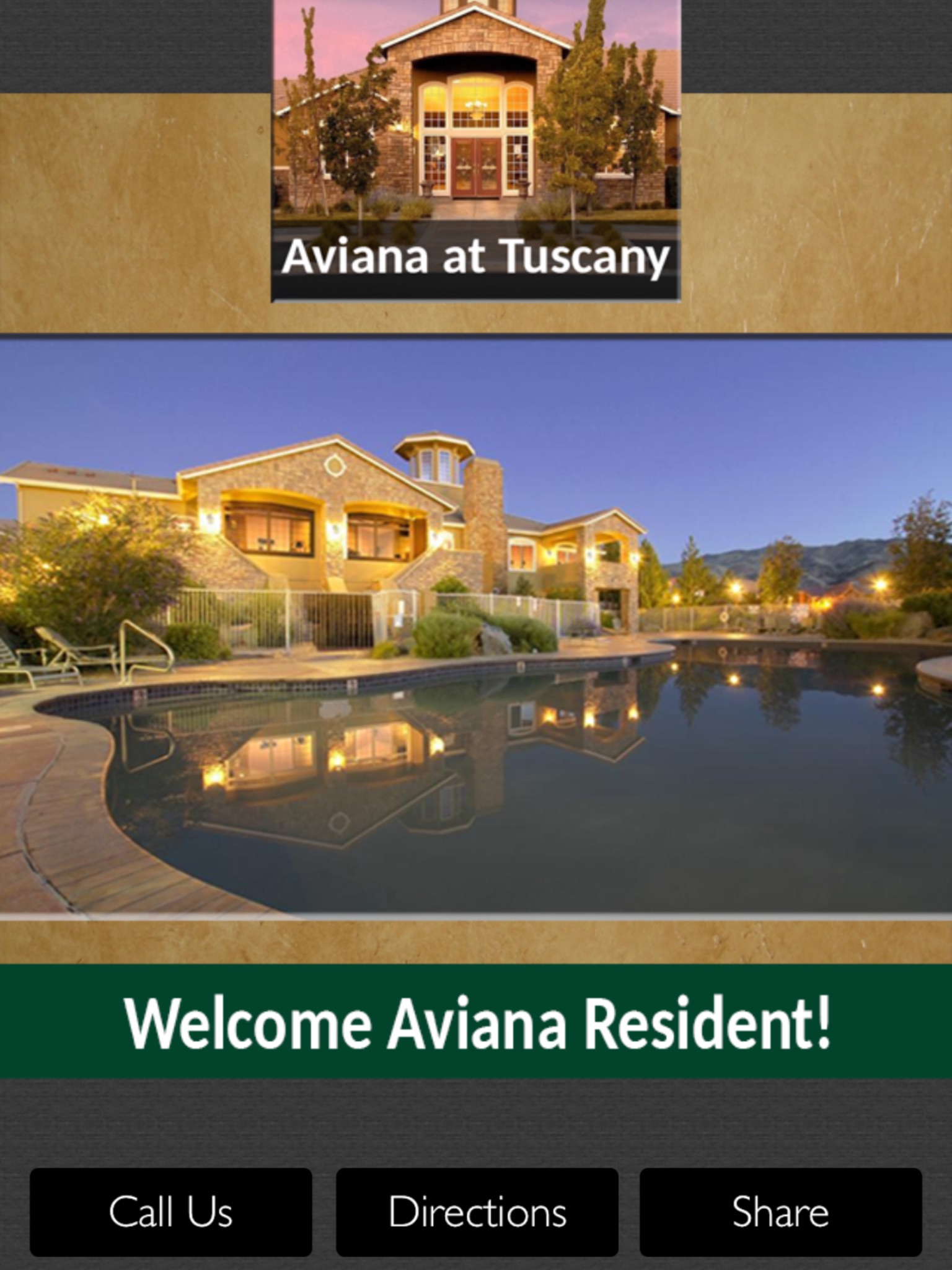 Aviana at Tuscany is a Resident ONLY App, designed to easily connect Property Management with Residents. The tools provided within the app will conveniently enable residents to receive the latest updates from management, pay rent, request maintenance, leave reviews and much more. We hope that you will enjoy this app as a resident of Aviana at Tuscany!
