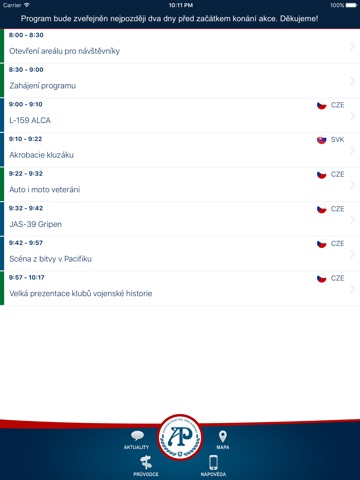 The application shows actual program of the 26th Aviation fair in Czech Republic. The program is updated for current day.