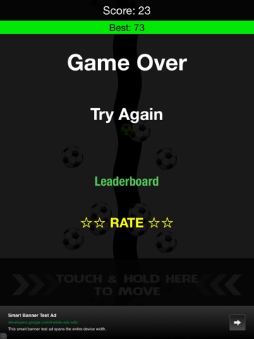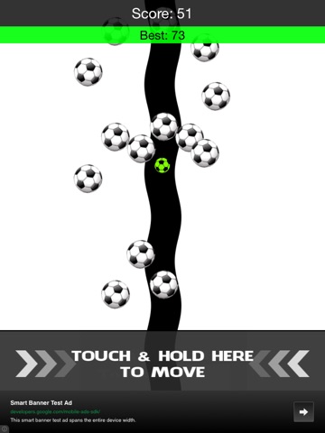 The game is simple, move the green soccer ball along the line as far as you can. But be careful, its not that simple, you have to avoid the white soccer balls at the same time. Seems easy but it is a challenge. See how high of a score you can get!