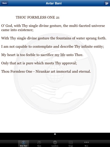 It contains 376 hymns which describe the qualities of Formless God (Nirankar), the important role of a True Spiritual Guide in attaining God realisation, the kindness and grace of the True Master, the purpose of human life, the five fundamental principles, true devotion and how a man can lead a saintly life. The Avtar Bani is not worshipped as a holy religious book like the Quran or the Bible, but it is highly regarded by the Nirankari devotees for its authenticity.