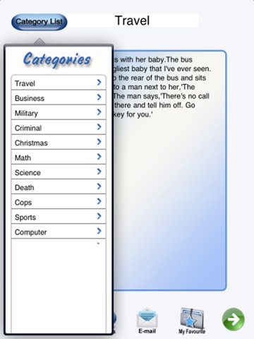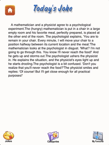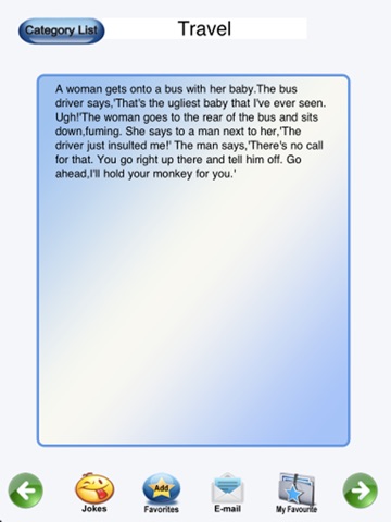 Awesome Joke Collections! Which gives you quick access to a collection of fun and hilarious jokes with the tap of a button. Next time you are at a party or with friends, make everyone laugh with this awesome joke collections. You can share your jokes with your friends via email, and most importantly have a good laugh. Jokes are typically for the entertainment of friends and onlookers. The desired response is generally laughter.Jokes have been a part of human culture.That a joke is best when it expresses the maximum level of humour with a minimal number of words, is today considered one of the key technical elements of a joke.