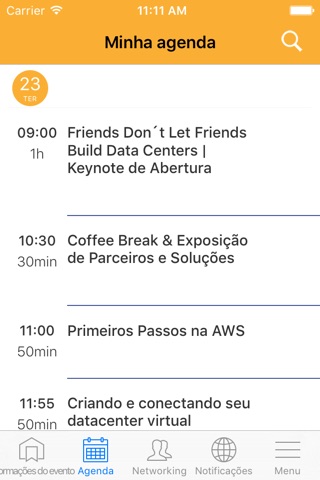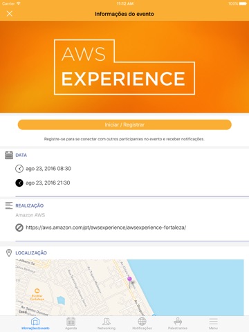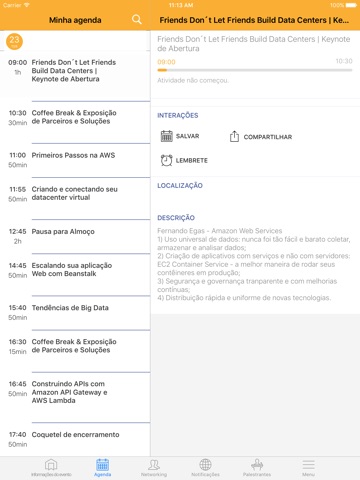 O app AWS Eventos Brasil é a melhor forma de interagir, engajar e participar do evento! Você estará acompanhado durante todos seus dias, recebendo informações, notícias, promoções e muito mais. - Visualize a agenda do evento em tempo real. - Converse com todos os participantes presentes no evento para marcar reuniões e mandar mensagens instantâneas. - Compartilhe fotos, vídeos, insights e muito mais em uma rede social exclusiva do evento. - Avalie todas as palestras que assistiu na hora em que as palestras acabam. - Saiba tudo que está rolando no evento através de mensagens instantâneas, promoções, ofertas e muito mais. - Veja todos os patrocinadores que estarão no dia do evento participando com você. - Envie perguntas e participar de enquetes em tempo real.