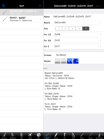 Don’t lose time finding out which screw is required to fit your fin into the board, where to position the harness lines on the boom, which boom length to set or how to tune your rig. Have a rapid look on your iPhone/ iPad to see how you did set up your material last time and start your new session right away with perfectly tuned material.