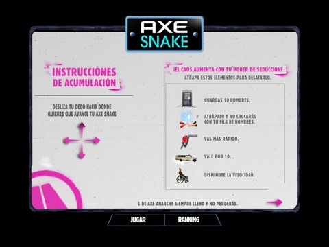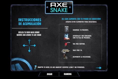 ¿Te acuerdas del famoso juego de la culebrita en los celulares?, pues AXE lo ha retomado para ponerle su estilo. En AXE SNAKE CAOS deberás estar atento y atrapar en el tablero la lata de AXE FRAGANCIA para hombre o mujer según la versión que estés jugando para así aumentar tu poder y desatar el caos.