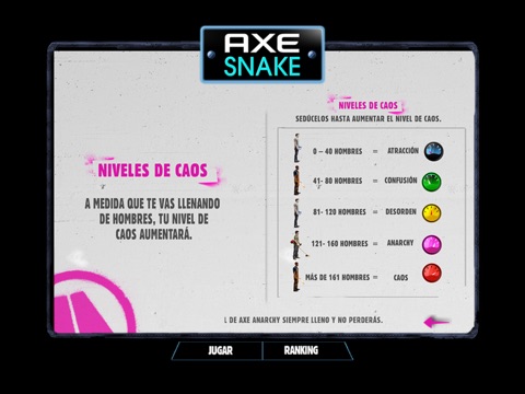 A medida que vas jugando vas acumulando hombres o mujeres, la fila va creciendo y tu nivel de caos aumentará, podrás desatar: atracción, confusión, desorden, anarchy, hasta llegar al máximo nivel y desatar el caos.