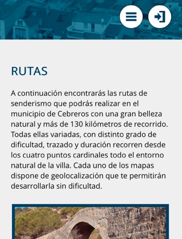 Aplicación móvil oficial del Excmo. Ayto. de Cebreros desde la que podrás acceder a toda la información turística y de servicios de la zona. Ademas podrás ver las rutas principiares de senderismo y seguirlas por geolocalización, conocer las últimas noticias y ver galerías de fotos de los eventos más destacados. Esta aplicación utiliza sistema de geolocalización. El uso prolongado de esta característica acelera el consumo de la batería de su dispositivo.