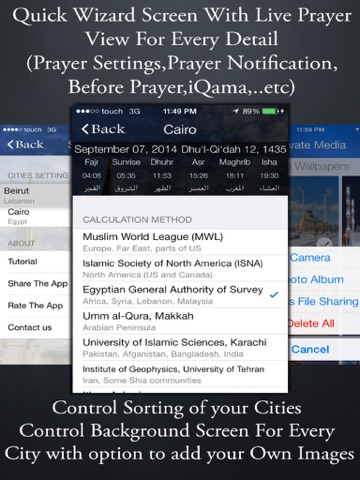 4-Swipe between Cities with Left & Right Swipe on Home screen with full control to enabledisable prayer notification for every prayer,Add Event with single touch on prayer time and Share prayer times with single touch of the cities Name.
