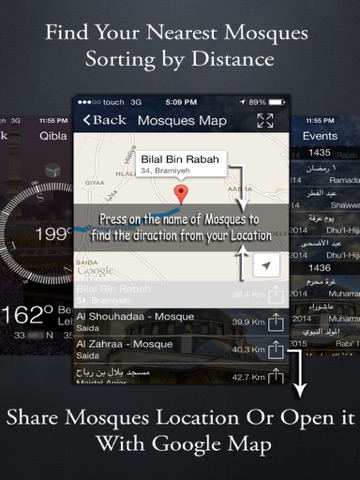 9-Find your nearest Mosques sorting by distance and all you have to do is to choose the name of the mosques that you want to pray on and the app will route the road for you and also you have an option to share mosques location or open it with google map for extra route option.