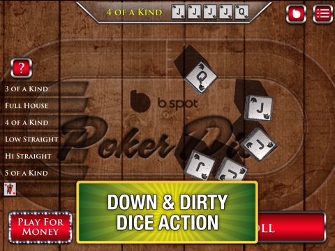 b spot Poker Dice offers b spot mobile gambling. b spot is a licensed real money gambling platform that fuses the pulse-pounding excitement of horse racing with the on-demand fun of mobile games. Your b spot bets are placed on live horse races around the world. Your winnings are determined by the results of those races. Play b spot games to discover and collect your winnings. All deposits FDIC insured.