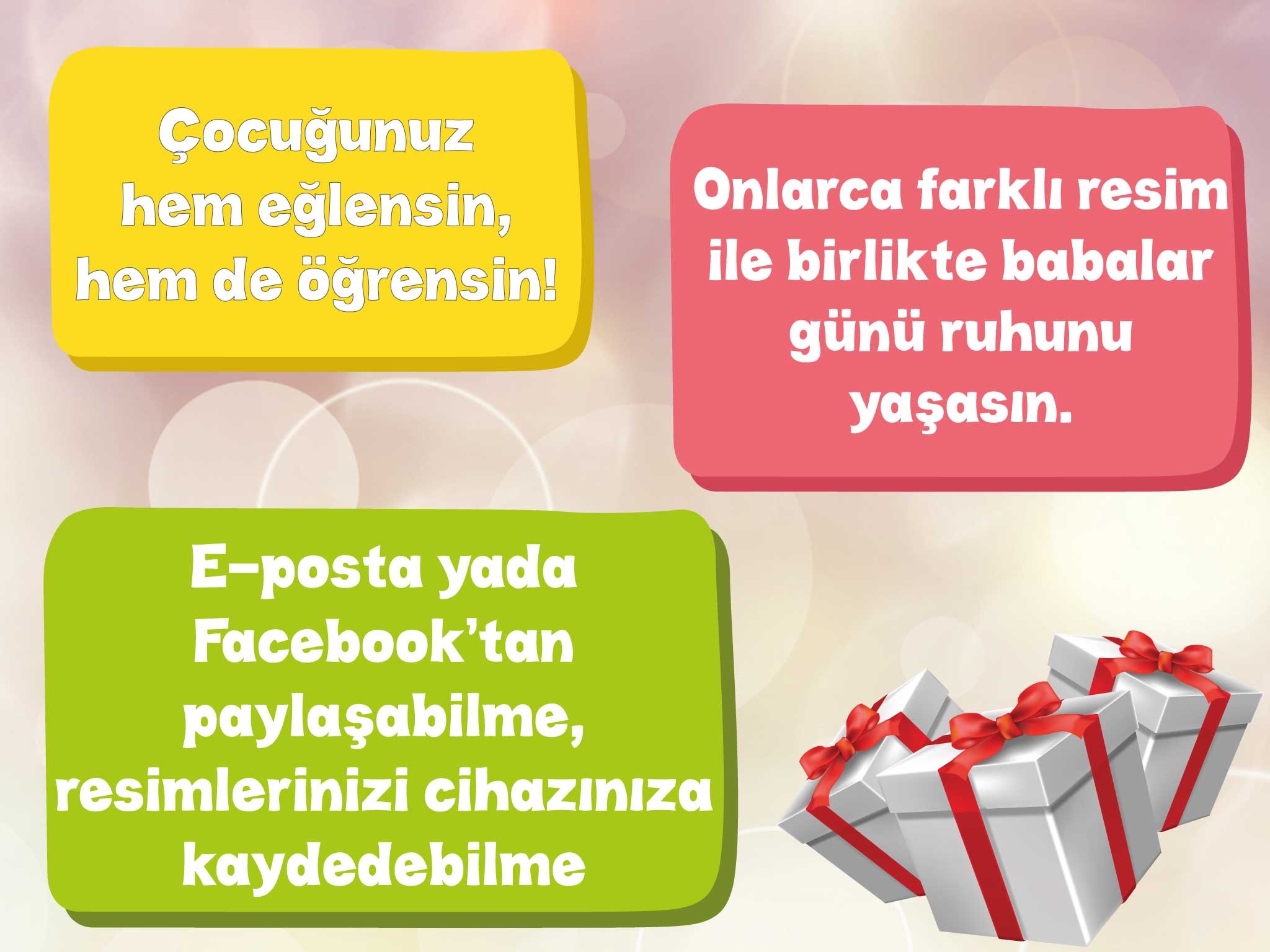 Çocuklarınızın zeka gelişimine oldukça katkı sağlayacak uygulamamız ile birbirinden farklı resimleri boyayarak onların Babalar Günü ruhunu daha iyi tanımalarına yardımcı olacaksınız. Ayrıca çocuğunuzun yaptığını boyamaları Facebookta paylaşabilir, sevdiklerinize e-posta olarak gönderebilir yada kendi resim galerinize kaydedebilirsiniz!