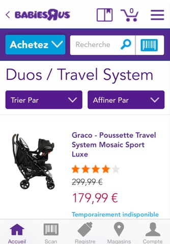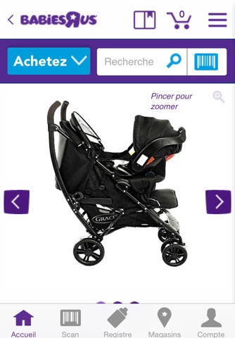 En tant qu’expert pour satisfaire les besoins des bébés et des nouveaux parents, Babies’R’Us, l’espace 100% puériculture de Toys’R’Us, sait que votre temps est précieux lorsqu’il s’agit d’obtenir les meilleurs produits et conseils de la part d’une enseigne de confiance. Notre application marchande vous permet de trouver des produits de qualité et de les acheter immédiatement depuis votre mobile. Vous y trouverez toutes les mêmes fonctionnalités que vous connaissez déjà de notre boutique en ligne, avec des fonctions avancées, comme « Trouver votre magasin » qui permet de retrouver les itinéraires et horaires d’ouverture de vos magasins, les promotions du moment dans les magasins de votre région, des informations sur les produits et des avis clients pour vous aider à faire le bon choix pour votre famille. Vous souhaitez visionner des vidéos ou en savoir plus sur un produit? Il suffit d’utiliser le lecteur de codes-barres intégré !