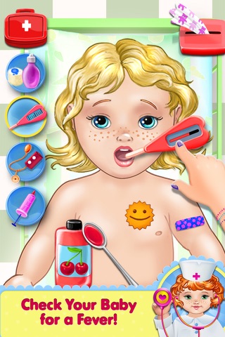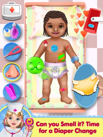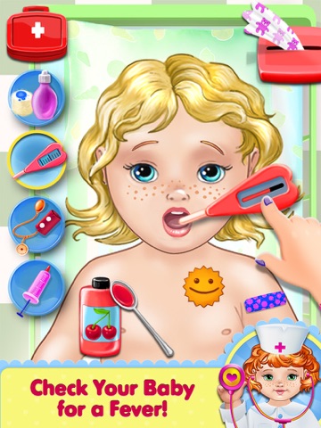 Now it’s time for the most precious patient of all-- babies! These babies thankfully are healthy, but they sure are playing sick so they’re here for your help! Start by choosing from 4 adorable babies who need your care and listen to their heart: when you squeeze their hand they’ll even tell you they love you! Follow your nose to see if your baby needs their diaper changed with your awesome new smell detection. Use the lamp to cast light on the baby, it can even shine with cool stars and bubbles! Did your baby patient get a sticker, too? No worries Doctor, you can handle it! Use the awesome new sticker removal by rubbing cotton gauze on the tattoo and it will disappear like magic! Don’t forget to use your handy thermometer and check for a fever!