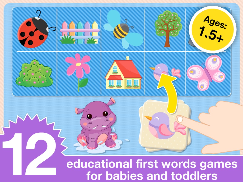 Children learn and have fun sorting pictures, finding the other halves of pictures, and identifying objects based on their name. Wonderful way to learn first words in English and other languages (U.S. English, U.K. English, Spanish, and French)!