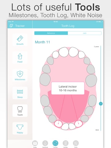 • Teeth Tracker logs your baby’s teeth development against monthly reference charts