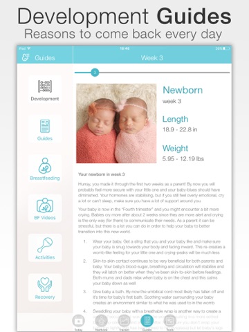 • Weekly development guides shows the growth of your baby, tailored to your baby’s age