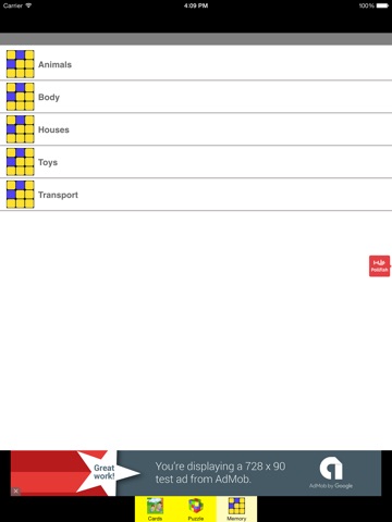 Alphabets, Animals, Body, Colors, Family, House, Senses, Shapes, Toys, Transport are the categories in this app.