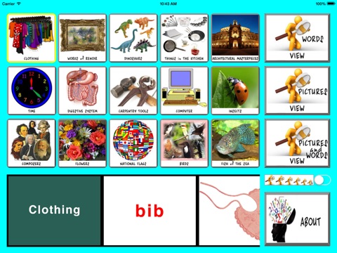 Bits begin playing after you choose a topic and the way of showing: pictures only, written names only or both pictures and their names. A new bit is shown every 2 seconds.
