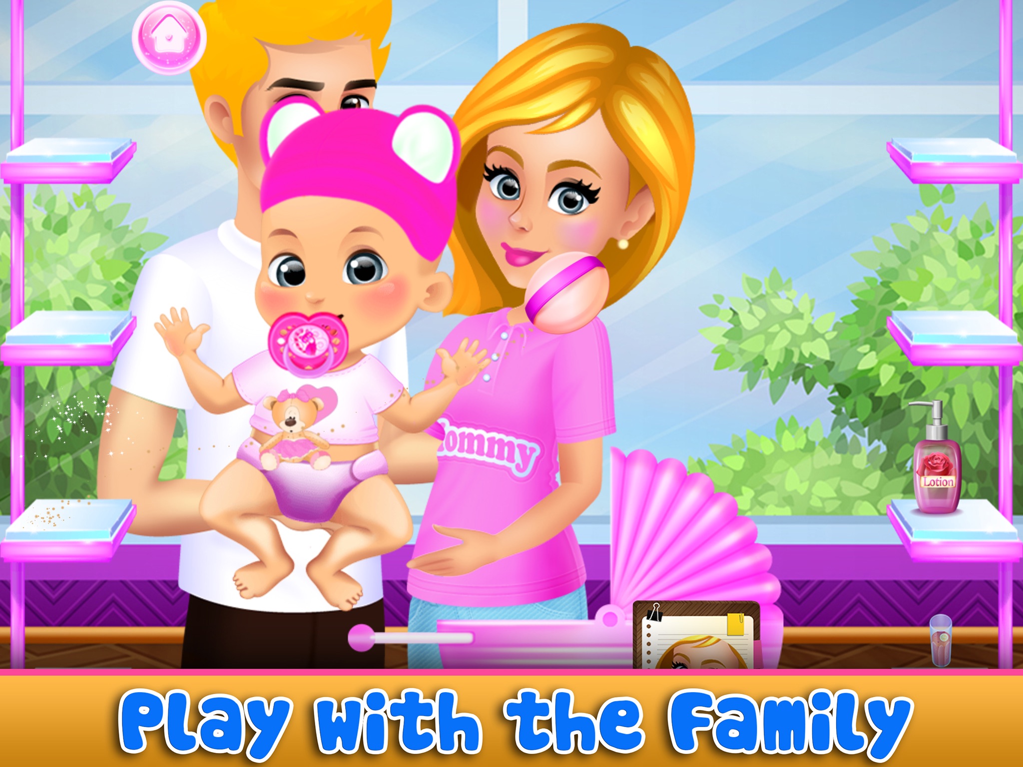 Come help care for the baby as she grows up! Fun sparkly & interactive levels with mommy, baby, daddy and more! Clean-up, feed, go to a party & play at home!