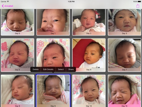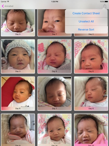 - Automatically sort the photos relative to the birth date of your little one. i.e. you can see at a glance whether the photo is that of the baby on Day 1 or Day 15 for example.