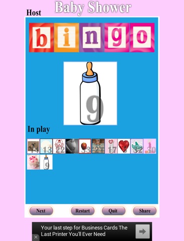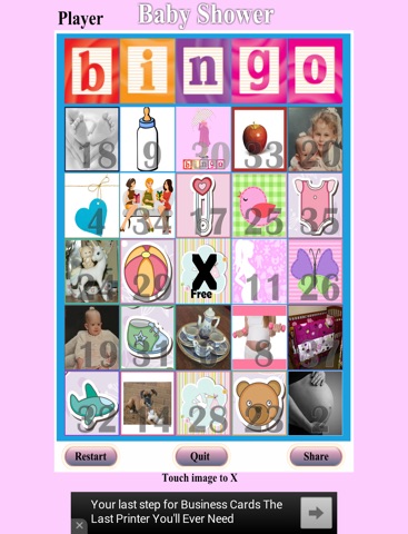 Filled with 39, cute, "baby" images. Users choose role of host or player. Choose "Host" to announce bingo images (say image name or number) in play. Choose "Play" for a randomly generated card. If image announced is shown on players card; players touch corresponding image to "X" & cover it up. Each card is randomly generated & most likely no two players will have the same card. Continue on til somebody yells "BINGO!"