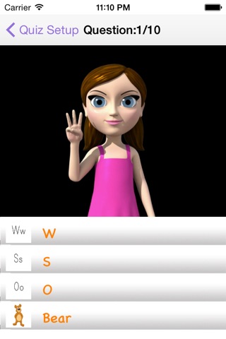 Finally, the app also has a fun quiz/game feature for your little one to test his or her ASL knowledge! You can set it as easy or as difficult as you like. You can select certain categories or have it draw on the whole list of words.