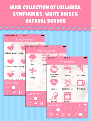 • Categories: Lullaby songs, White Noise, Nature sounds, Symphony.