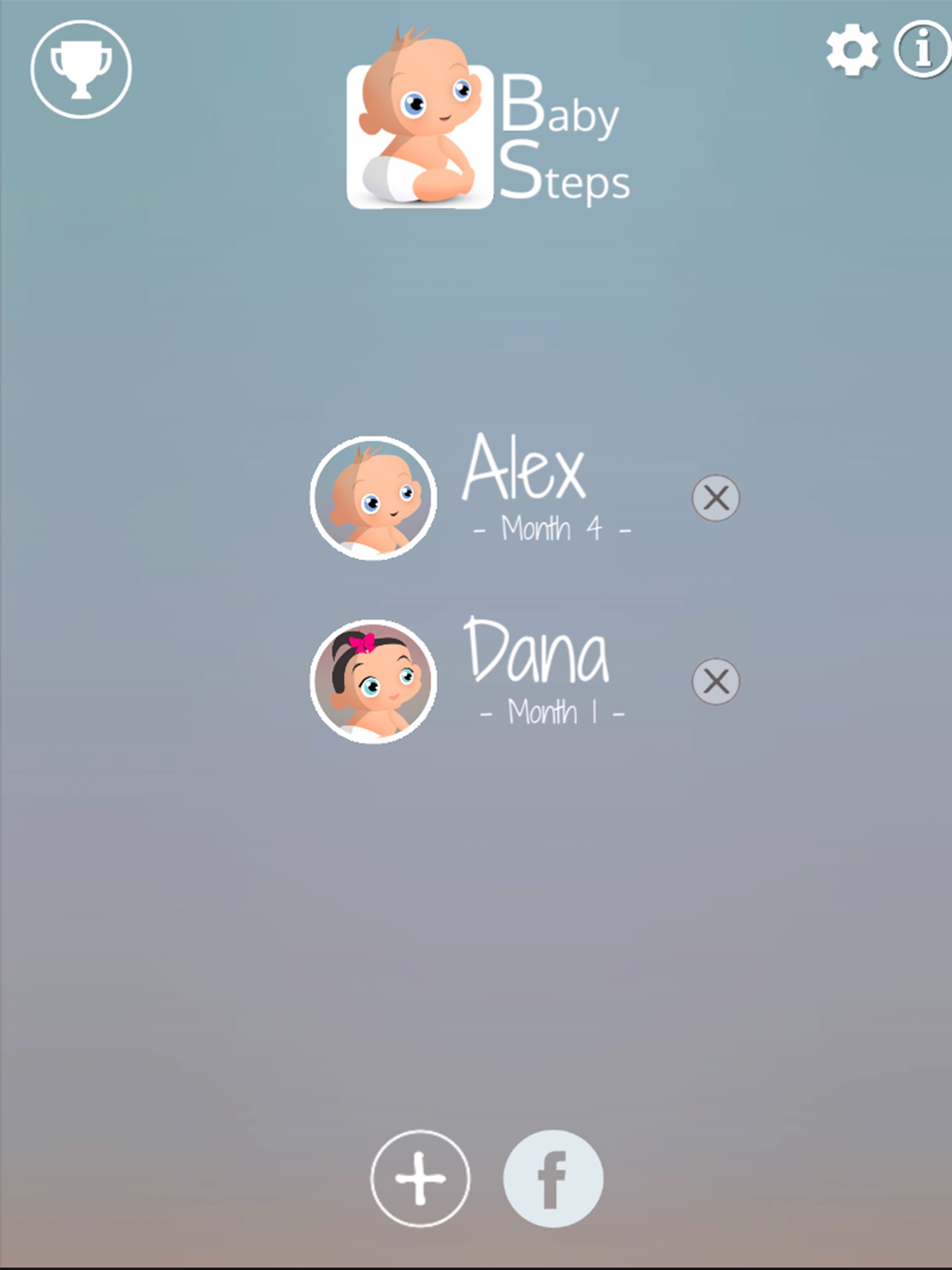 Just add your children in the list and start marking your babys achievements. All the development steps are organized in sections like : motor skills,cognitive development,language skills, social and emotional skills. As your child grows , sleeps and dreams follow his development and mark the achievements. Talking , walking, playing little games are all signs of progress.