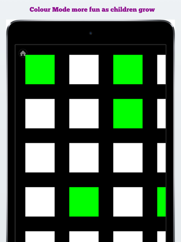 As they get older, you can enable Colour Mode which will randomly include green into the patterns. Since this colour is randomly distributed it will jump out once your babys vision has developed sufficiently to see in colour (babies only see high contrast - i.e. black and white until they are a few months old)