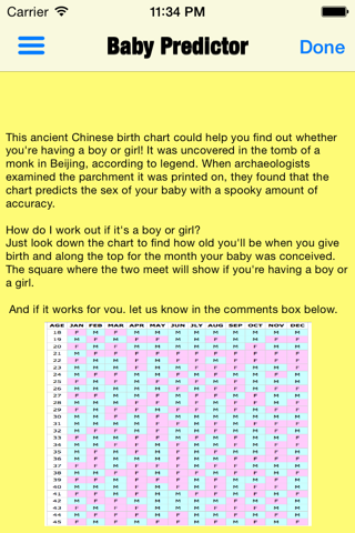 Baby Predictor is an app created to predict when the best time is to concieve a baby boy or a baby girl.