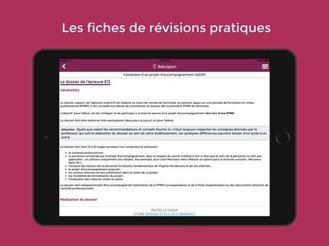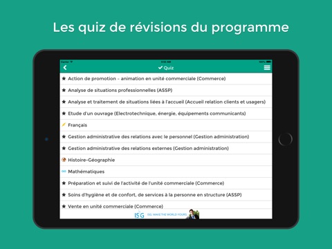 L’application mobile Bac PRO 2018 par L’Etudiant est réalisée avec les matières communes aux bacs et un focus pour les bacs pros : commerce - accompagnement, soins et services à la personne - électrotechnique énergie équipements communicants - accueil relation client et usages - gestion - administration