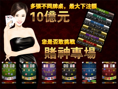 * 多张不同桌台,最大下注额高达10亿,看你能否独孤求败,成为赌神!*