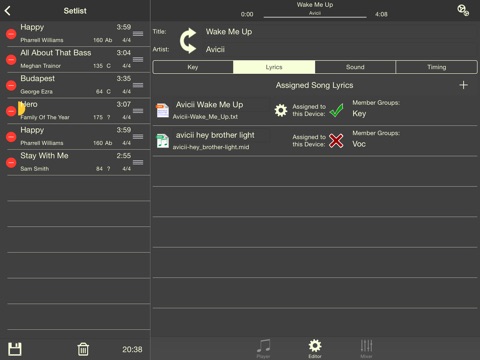 ● Go Wireless- Control lyrics scrolling and song play with wireless remote controller devices like AirTurn BT105, iRig BlueBoard, or other MIDI-based devices like Korg nanoKontrol.