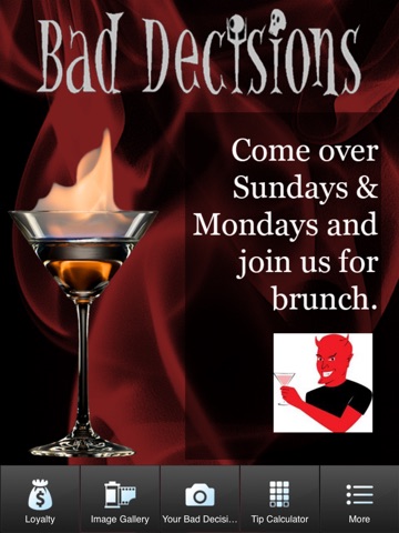 Welcome to the Bad Decisions App, Baltimores definitive App for those times you wished you could have forgotten, but are glad you didnt. Our app features menus, drink recommendation, mixologist profiles, special events calendar and our app loyalty program. Its fun, full of great content and well alert you to all future Bacon Nights and drink specials.