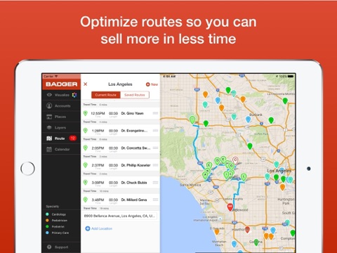 Badger Maps is your virtual field sales assistant, helping you focus on the right accounts, get the fastest multi-stop routes, find new leads, and keep all your customer data accessible and up to date in the field. It’s more than just a sales route planner. Its a total territory management solution that automates and optimizes all of your activities, from routing & mapping to prospecting to tracking mileage for expense reports.