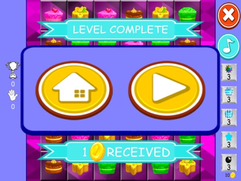 "Slide your finger through the cakes and combine them and complete missions. Your mission is send trophies to the bottom of the screen. Be fast when the level is based in time and when the level is based in number of movements, calculate exactly what movement will be the best"
