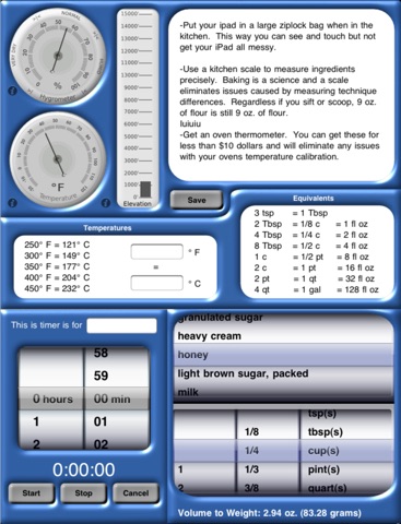 I bought this app last summer because it has ANY conversion I would need for my amateur attempts at baking. Most recipes have gram or ounces for weighing out flour proportions but my oatmeal cookie recipe only gave the amount in cups. Bakers toolbox to the rescue! Lower right is just the gizmo for doing this job. The cookies are getting great reviews. Thanks, CodeStork, another handy app for $0.99.