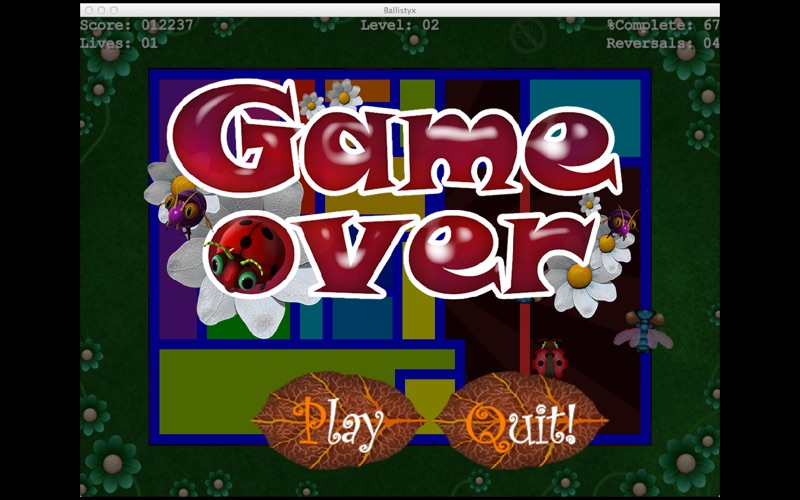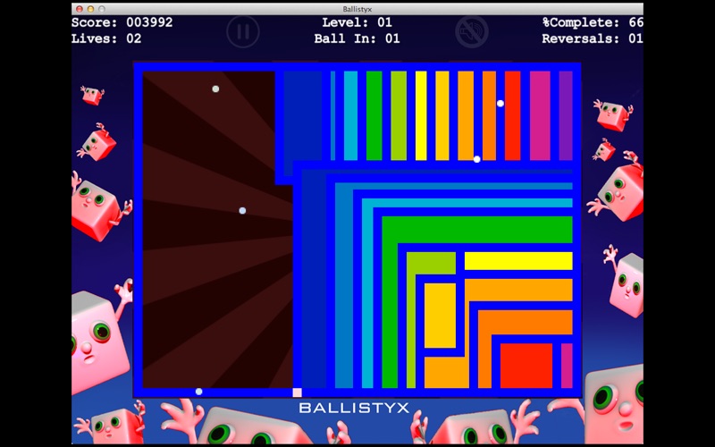 Move within the Blue thread relatively safely (Avoid the Ballistyx!) but to recover the fabric of time you must move into the empty space until you reach the edges of safety, leaving a trail of Red Yarn. Move quickly back onto the safe blue line. To create a patch which will be filled with new fabric. The bigger the patchwork, the larger you score!