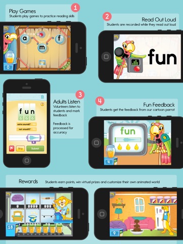 Student recordings are sent digitally to one of our army of volunteer “Listeners.” Listeners use the app to give feedback on the accuracy and fluency of student recordings using a simple touch interface. Listeners earn virtual rewards and rankings based on amount and quality of feedback. All Listener feedback is processed for accuracy and Listeners never know the identity of the students and cannot communicate directly with students.