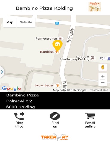På vores app kan du nemt se vores adresse på kortet, samt telefon nummer og ved få klik kan du bestille online.