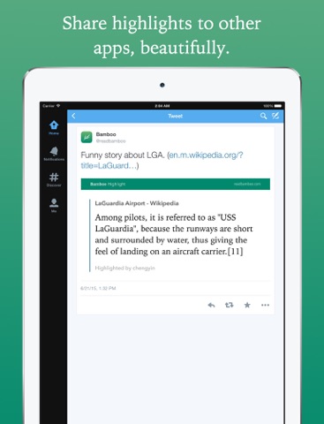 Bamboo automatically turns highlights into beautiful images. Its the perfect way to share text on Twitter, Facebook and other apps with no length limit.