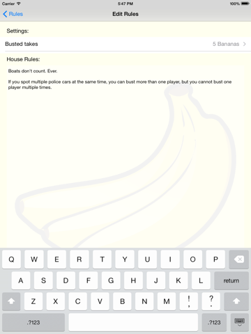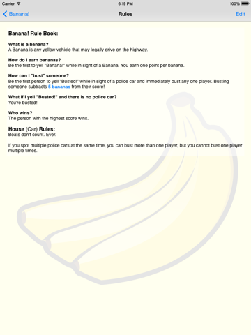 If you see a yellow automobile, be the first person to yell "Banana!", and you get a point. If you see a police car, be the first person to yell "Busted!", and you get to take points away from another player. Be careful. If you yell "Busted!" by mistake, youre busted.