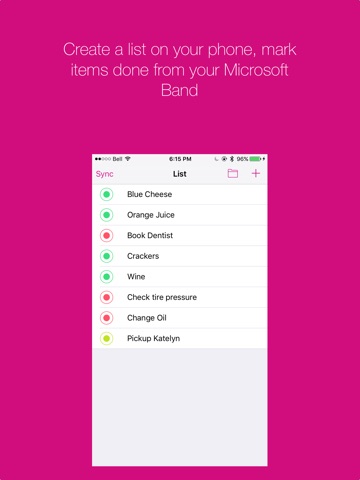BandList is a simple list application for your Microsoft Band. Groceries, gifts or tasks this app will allow you to create items on your iPhone, view and check them off on your Band.