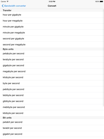 petabit per second, terabit per second, gigabit per second, megabit per second, kilobit per second, bit per second, pebibit per second, tebibit per second, gibibit per second, mebibit per second and kibibit per second