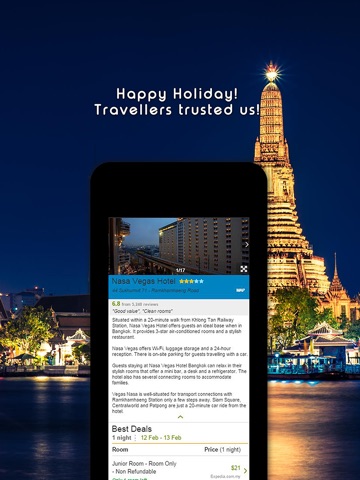 Bangkok Thailand Hotel Search, Compare Deals & Book With Discount help you to find and compare the best hotel deals from all major travel websites with one quick and easy search. No matter where in the world you are looking, how much is your budget, even at the very last minute, this app will find you the cheapest one to fit your budget and get you the best value for your money.