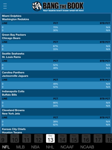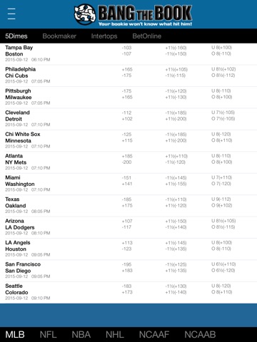 BangTheBook’s free sports betting information App features a mock sportsbook, leaderboards, free streak contest, daily betting trends, public pick consensus, top power lines from our exclusive power rankings, live odds and expert handicapper articles, game previews, free sports picks and more right to your iPhone. BTB covers all the major U.S. sports including the NFL, College Football, NBA, NCAA Basketball, MLB, and NHL.