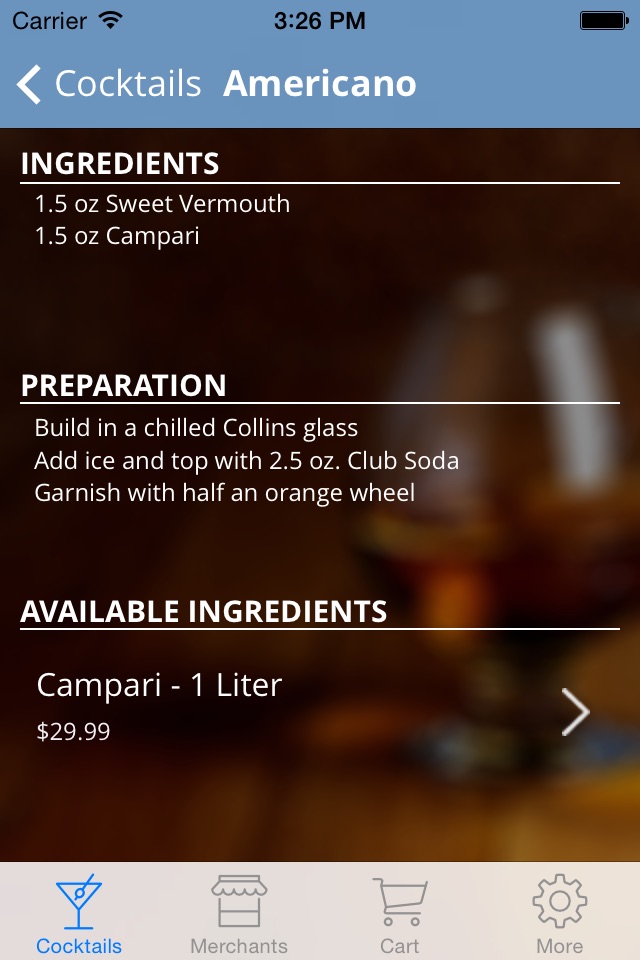 Bar Cart is a new way to discover great cocktails and easily order ingredients from local wine and liquor stores. Browse our expertly curated list of cocktails for inspiration, and easily add needed ingredients to your cart. Place an order to have the ingredients immediately delivered to your residence.
