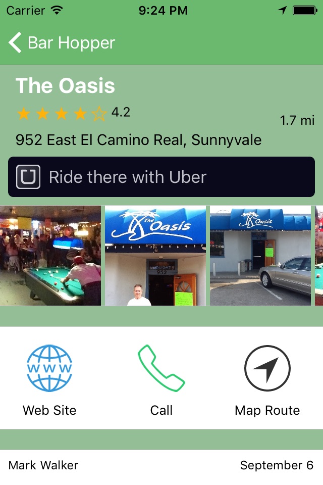 If you want more information about a bar, select it from the list to get the bars reviews, pictures and more. You can even go to their website, launch your Uber app, or call them directly from the app.